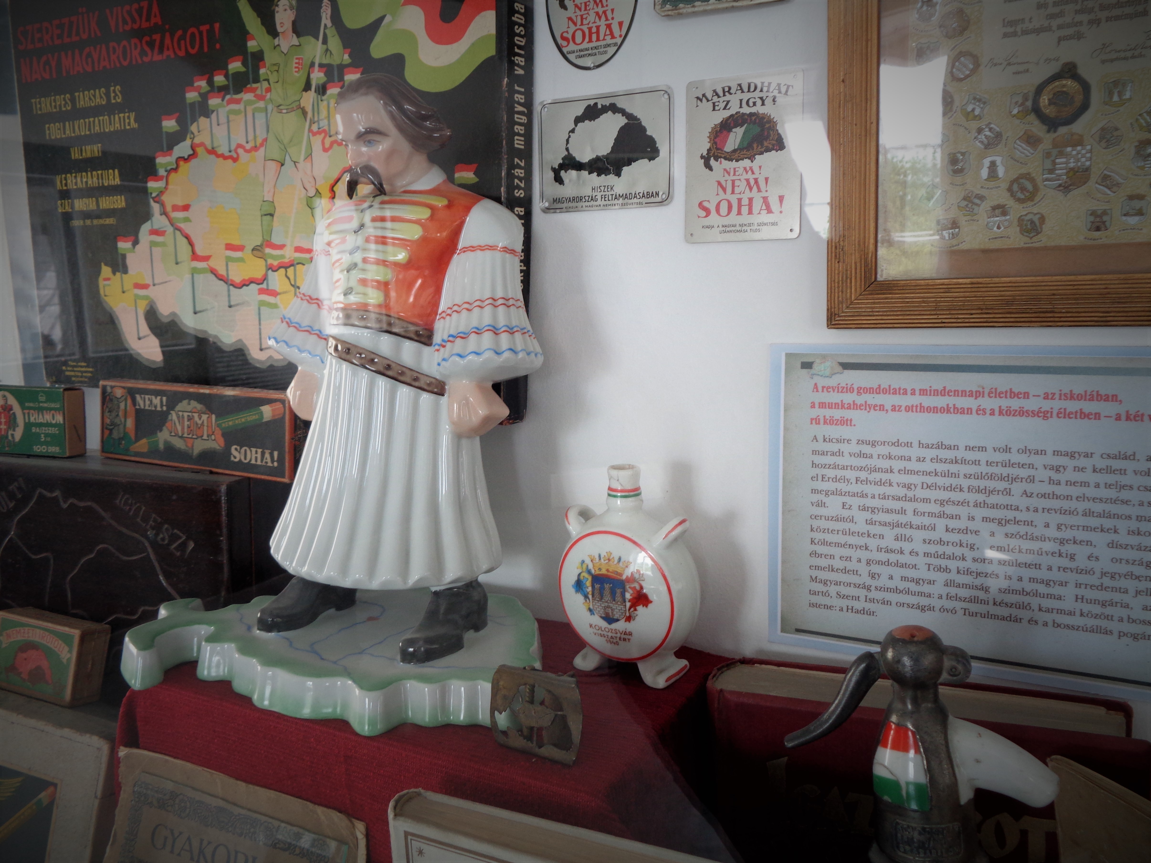 A kiállítás eredeti plakátok, szobrok, ritka irredenta relikviák, a Horthy-kultusz tárgyi emlékei és honvéd- valamint csendőr egyenruhák segítségével kalauzol bennünket vissza a 20-as, 30-as évek Magyarországára. A gyűjtemény egyik legszebb darabja az 1940 áprilisában, több tízezres tömeg jelenlétében felavatott szászrégeni Ereklyés Országzászló.